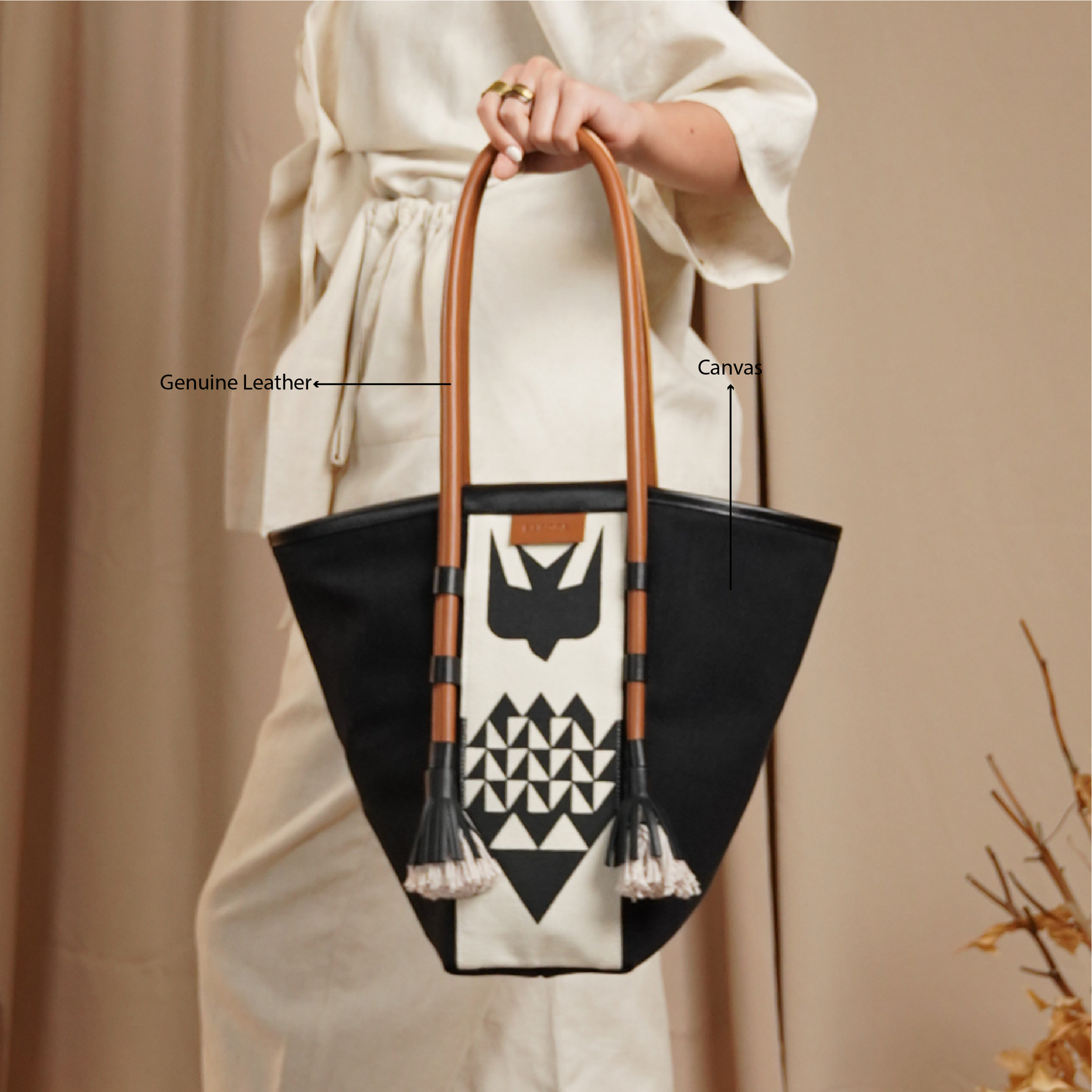 Inspired by primitive tribal art, Alia showcases our custom printed pattern in a central panel surrounded by a rigid genuine leather handle.