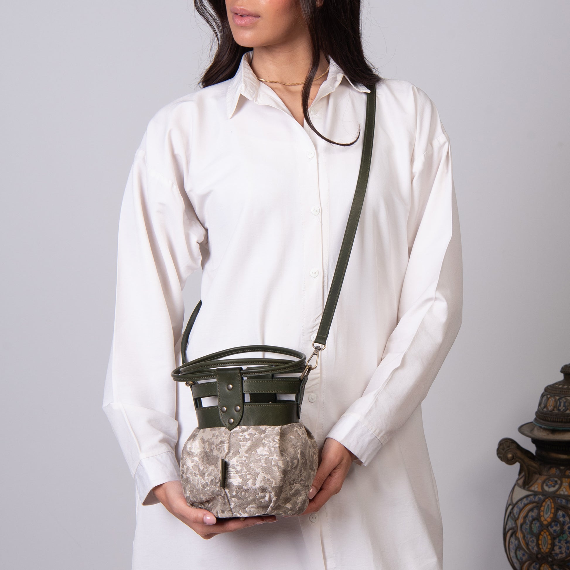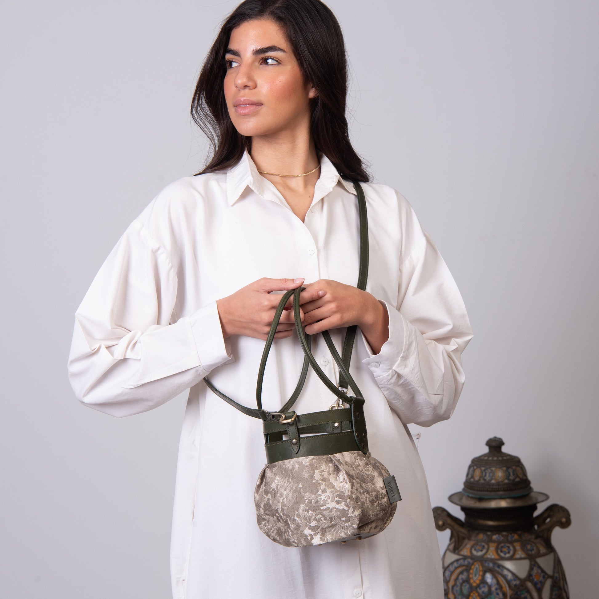 Fabric and leather in the intersection of the graceful and the tough. A round bundle that can easily be dressed up or down!