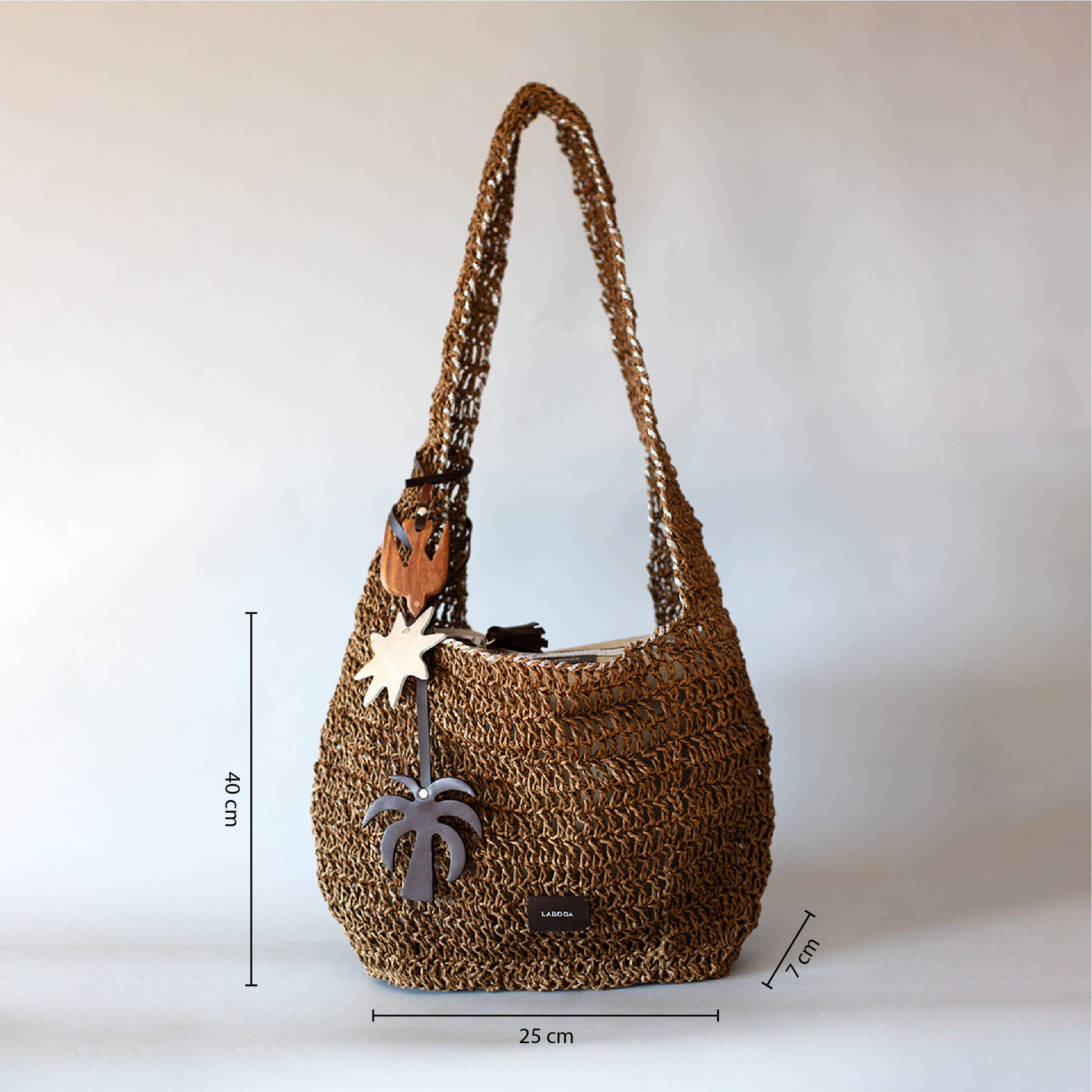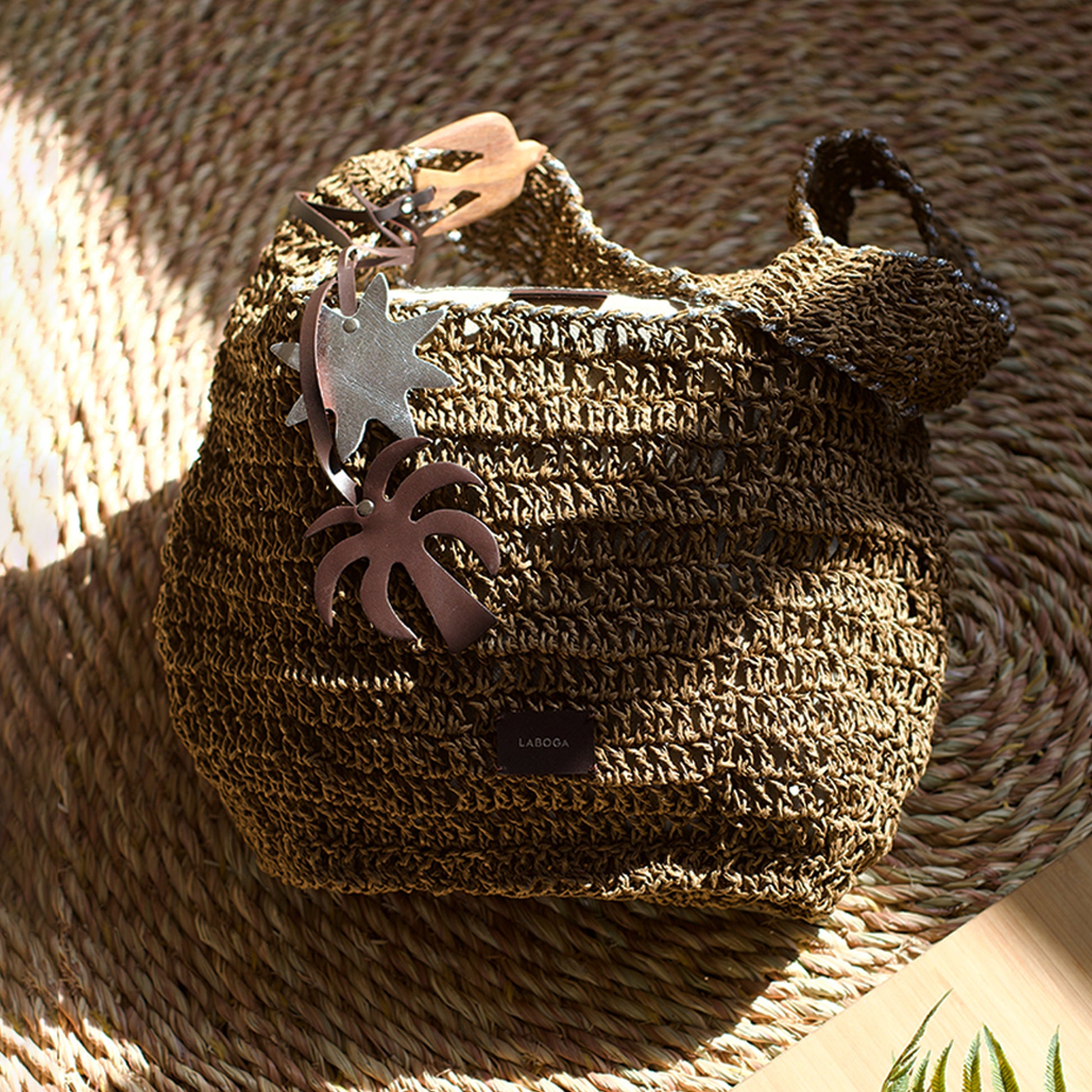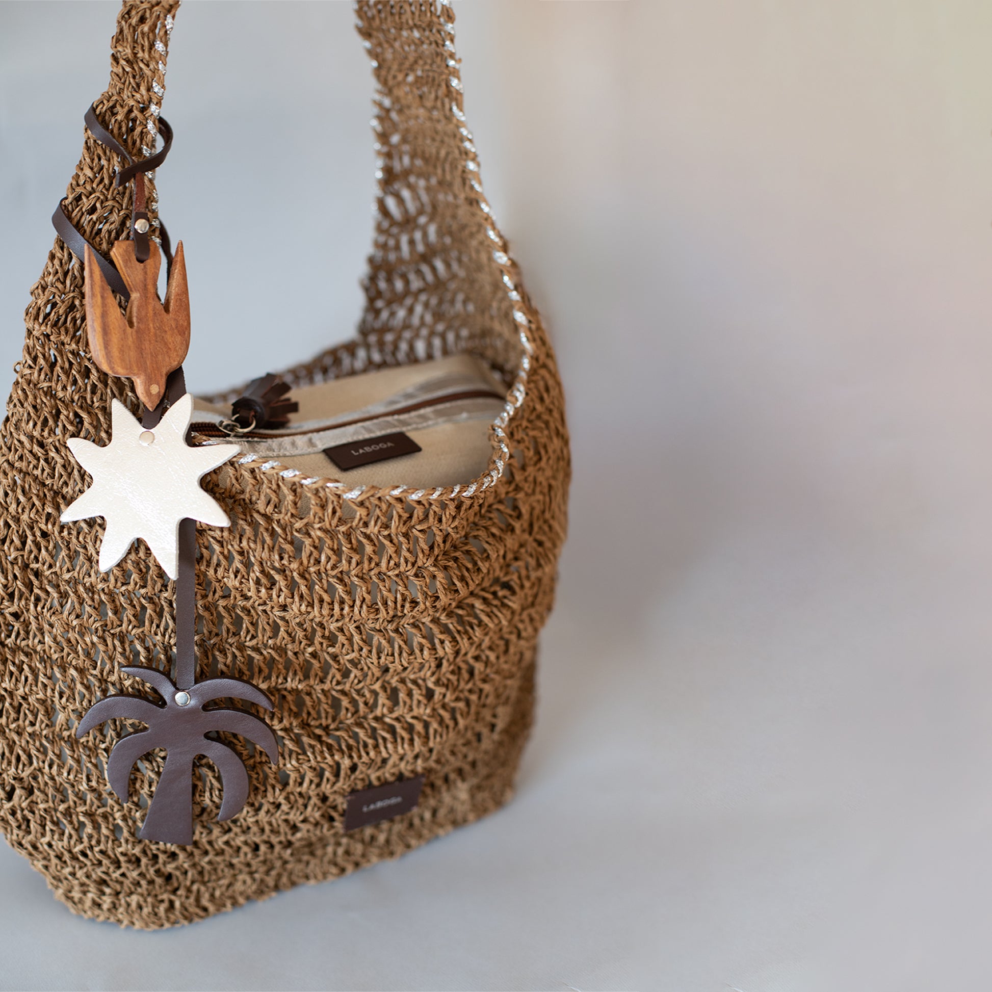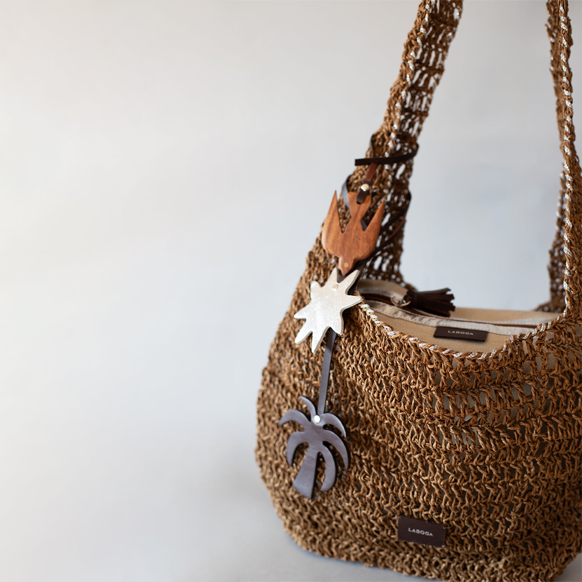 The toys and the details take precedence in this one! A silver sun, a leather palm, and a wooden bird complete the natural tableau on this silver-leather-encrusted and hand-crocheted handbag! A fabric inner baggie completes the function..