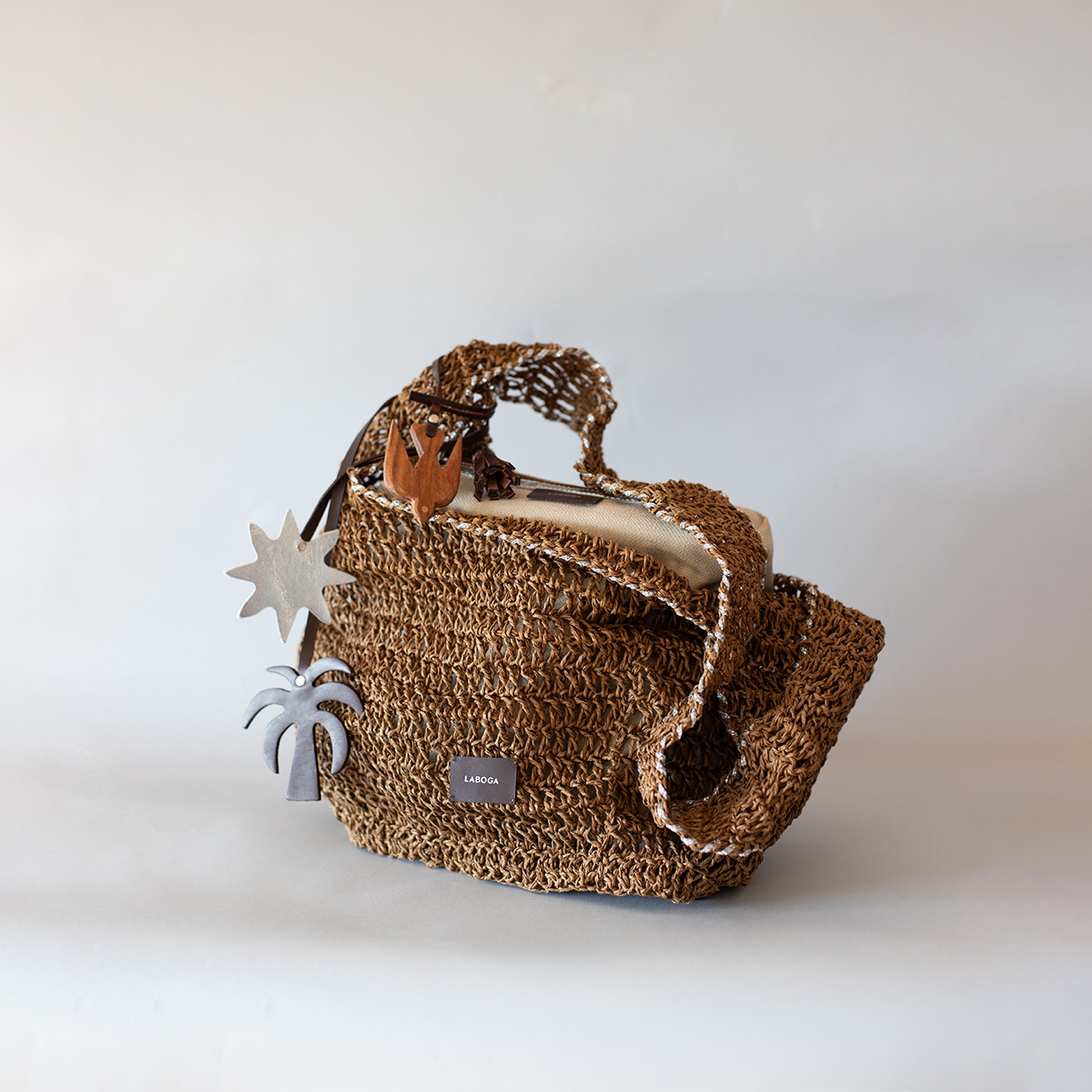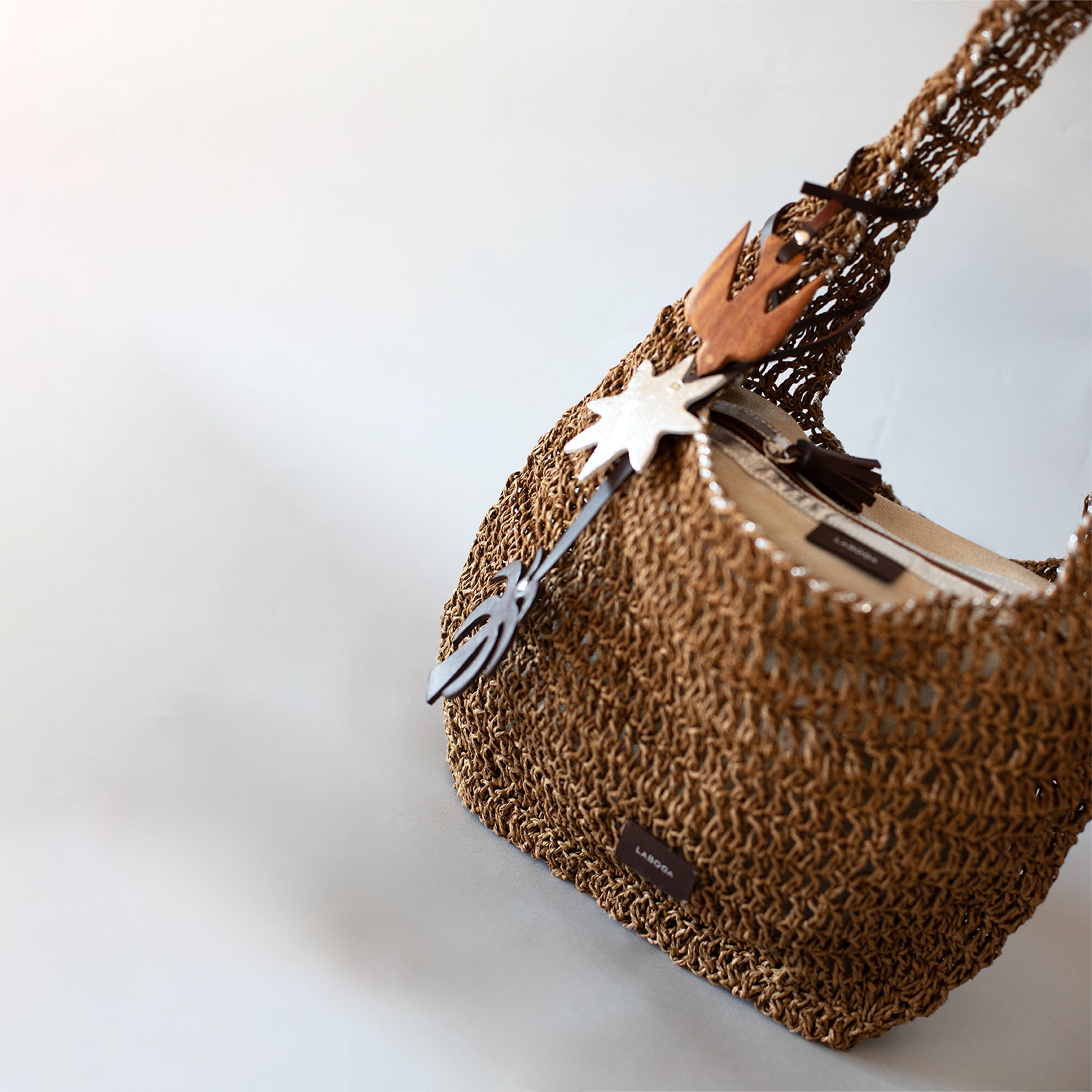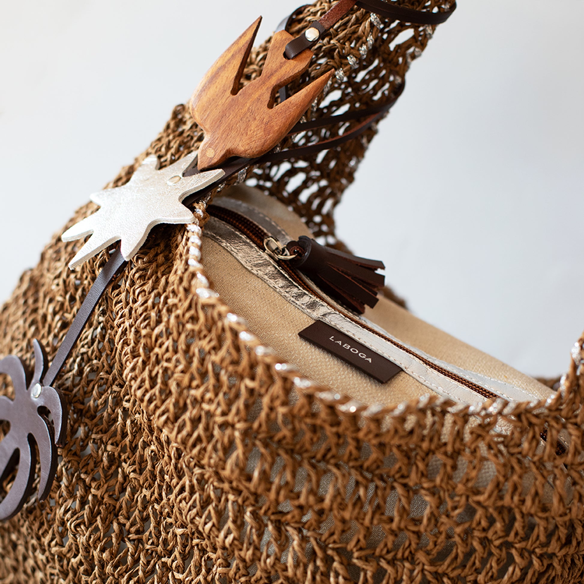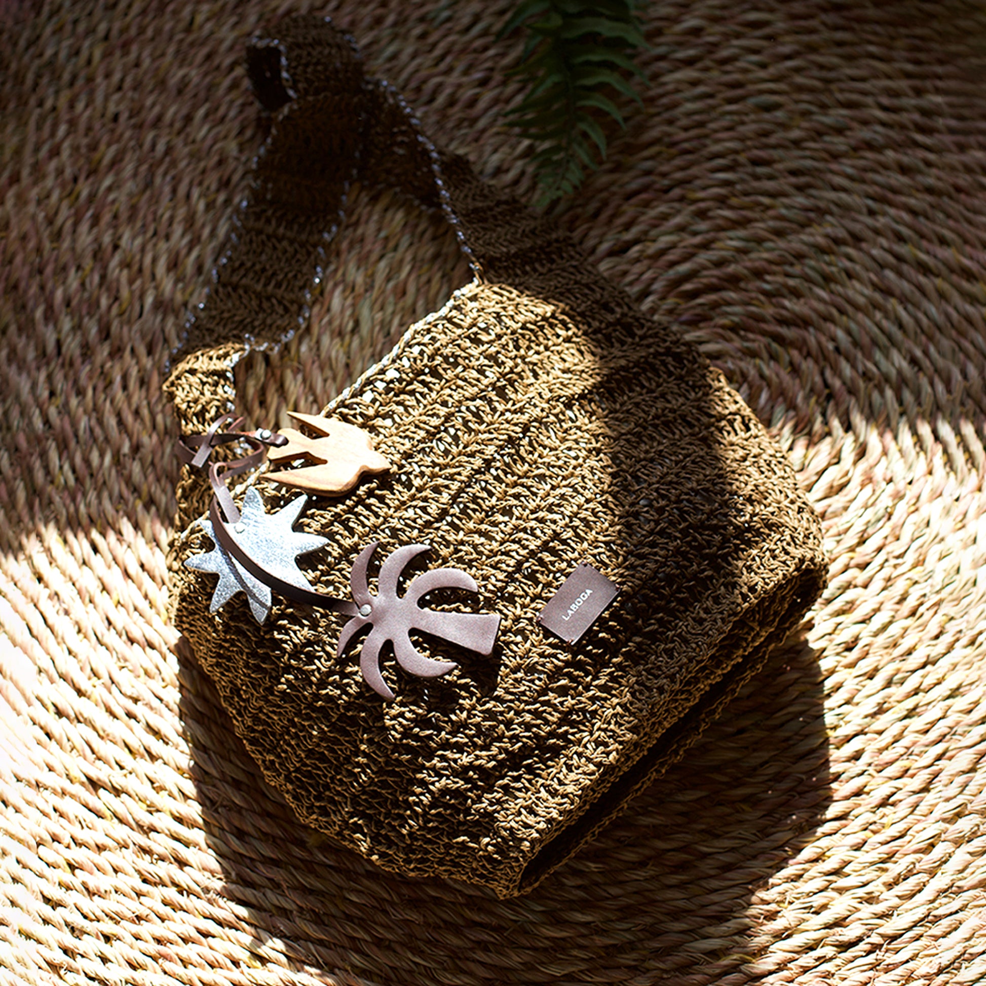 The toys and the details take precedence in this one! A silver sun, a leather palm, and a wooden bird complete the natural tableau on this silver-leather-encrusted and hand-crocheted handbag! A fabric inner baggie completes the function..