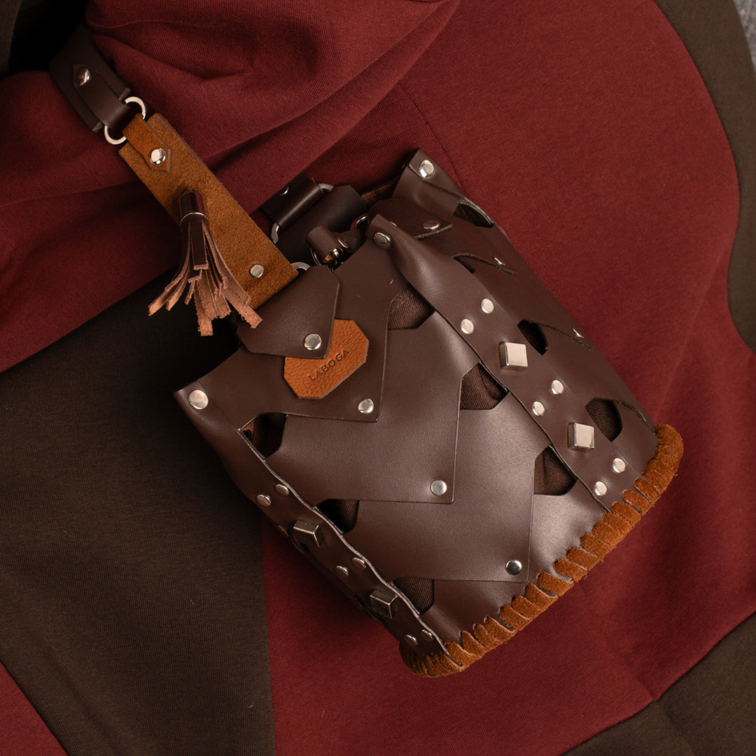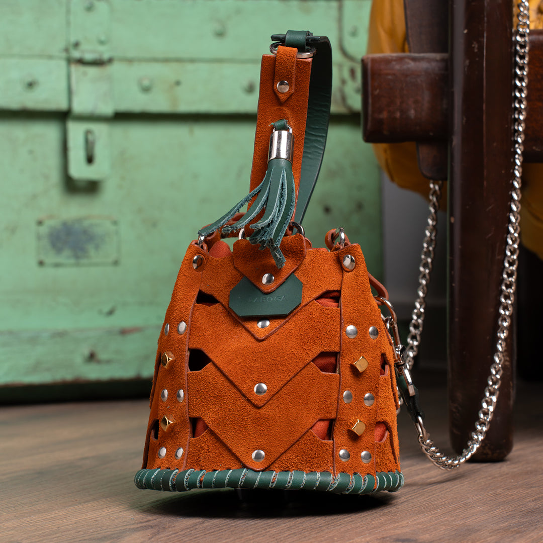 The Vertebrae Bucket is assembled by hand, using metal hardware. The roughness of the process is softened by the intricate shapes and metal details, yielding a unique, bejeweled piece.