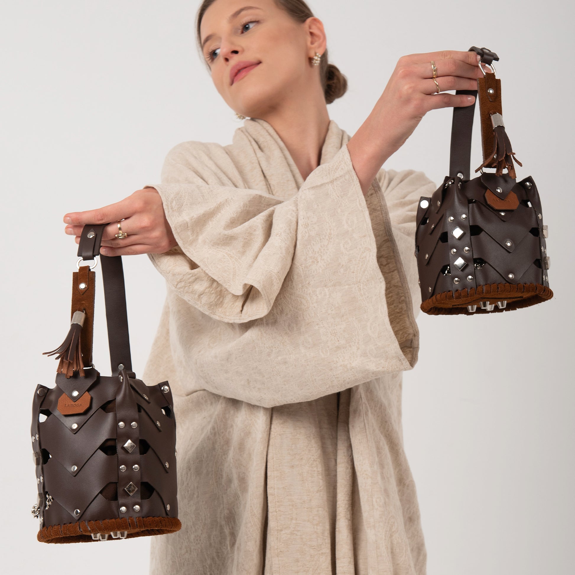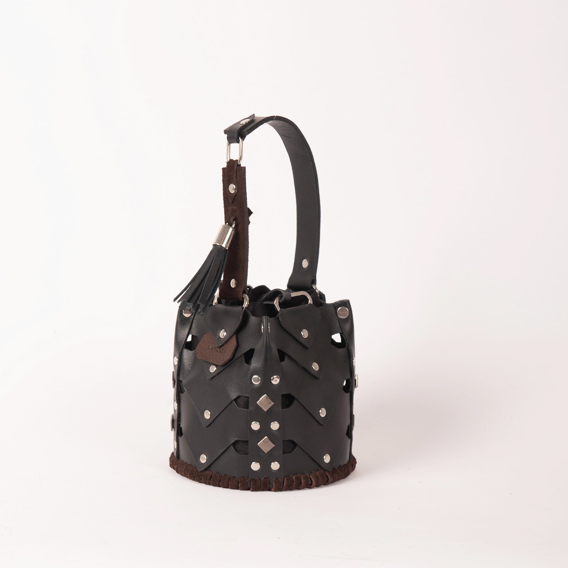 The Vertebrae Bucket is assembled by hand, using metal hardware. The roughness of the process is softened by the intricate shapes and metal details, yielding a unique, bejeweled piece.
